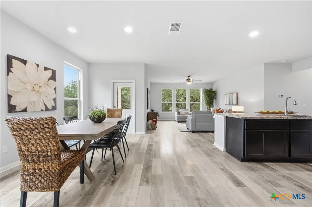 Located on a larger lot in the desirable Gatlin Creek neighborhood, this 2,716-square-foot two-story home offers a flexible floor plan, abundant storage, and inviting indoor-outdoor living. A welcoming entry with high ceilings opens to an open-concept kitchen, living, and dining area. The kitchen features granite countertops, a gas range, and walk-in pantry, while the dining area comfortably seats 6–8. A main-level bedroom and full bath provide excellent flexibility. Upstairs, a spacious game room separates the primary suite from secondary bedrooms. The primary suite offers treetop views, two walk-in closets, a soaking tub, and separate shower. Enjoy a covered back patio overlooking a large open yard, plus a covered front porch and mature oak trees.